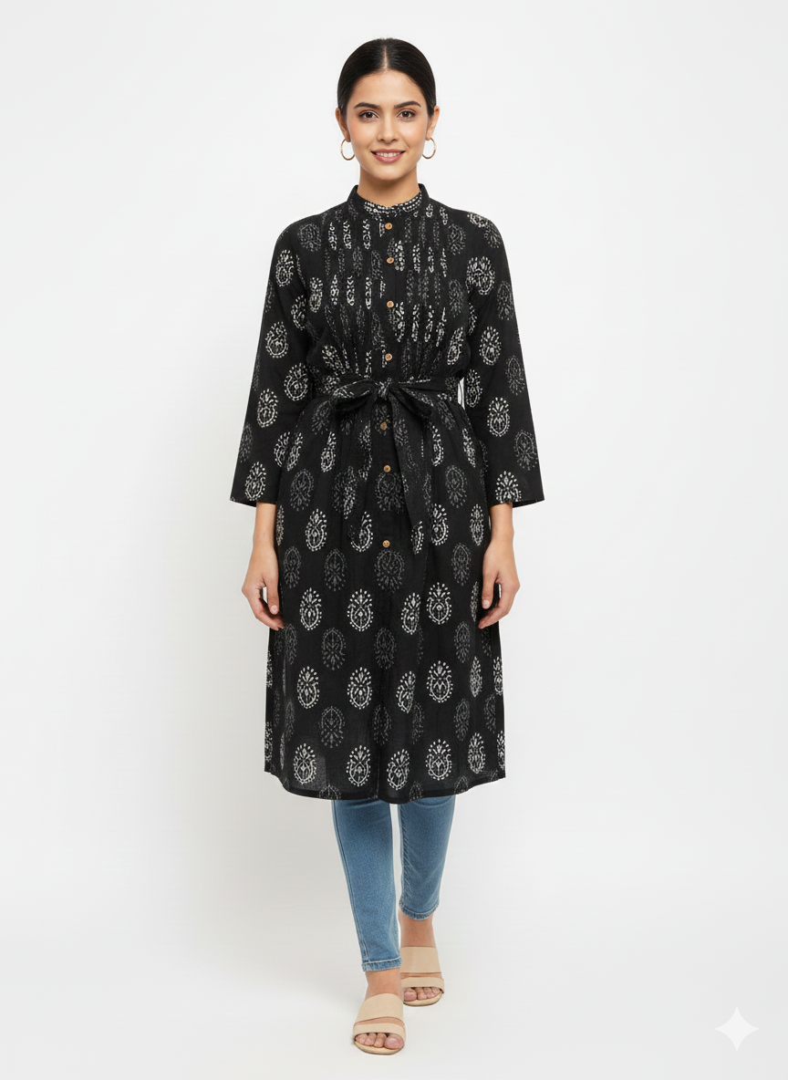 Crafted from pure, breathable cotton, this stunning black and white kurti is a must-have for your wardrobe. The intricate pintex design adds a touch of sophistication, while the contrasting white print creates a modern and eye-catching look. Featuring a stylish collar and a tie-up waist, this kurti offers a flattering fit for all body types. Perfect for both casual outings and special occasions, it can be paired with your favorite leggings, palazzos, or jeans.