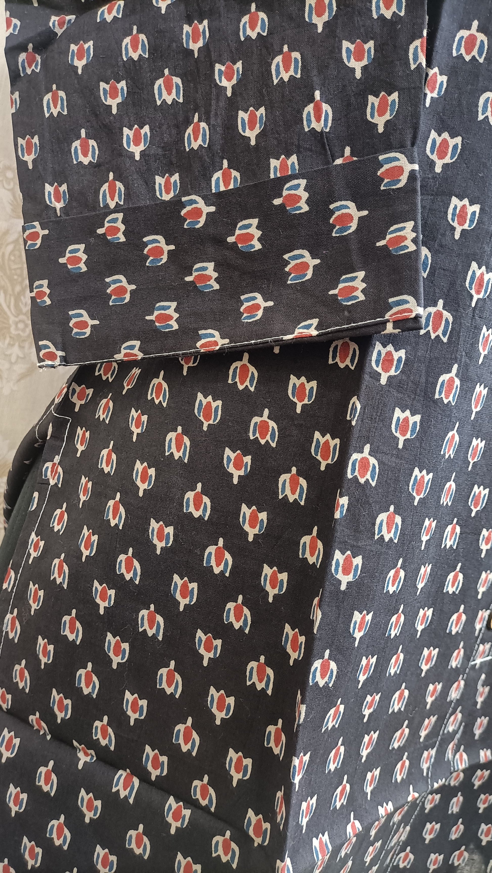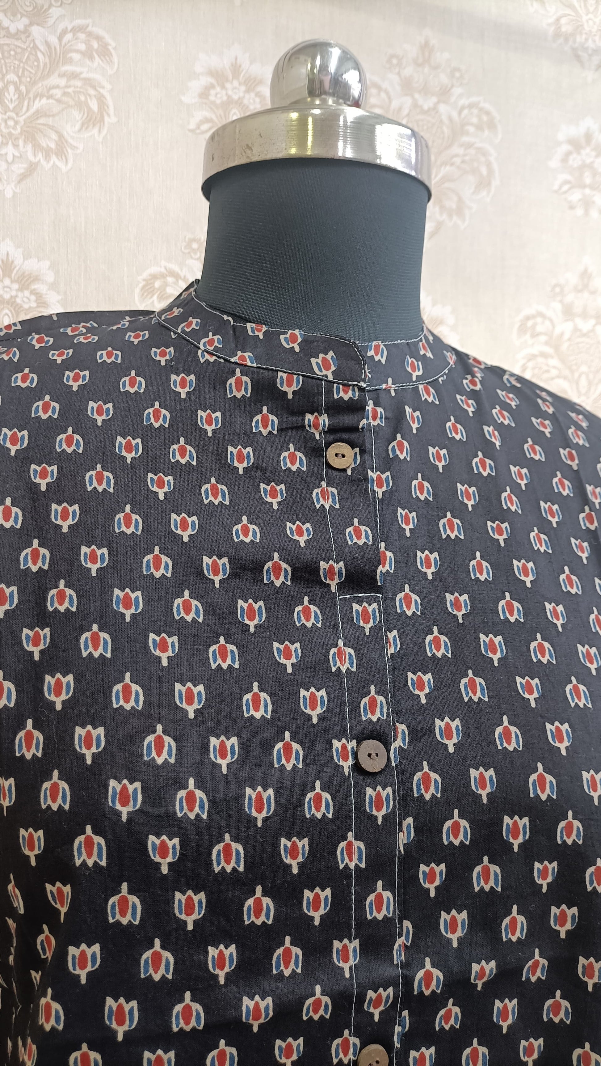 The tunic features a striking ditsy geometric print in Red and Off-White against a rich Black or Charcoal background. This traditional hand-block printing technique lends an authentic, artisanal appeal to the garment, ensuring you stand out with understated style.