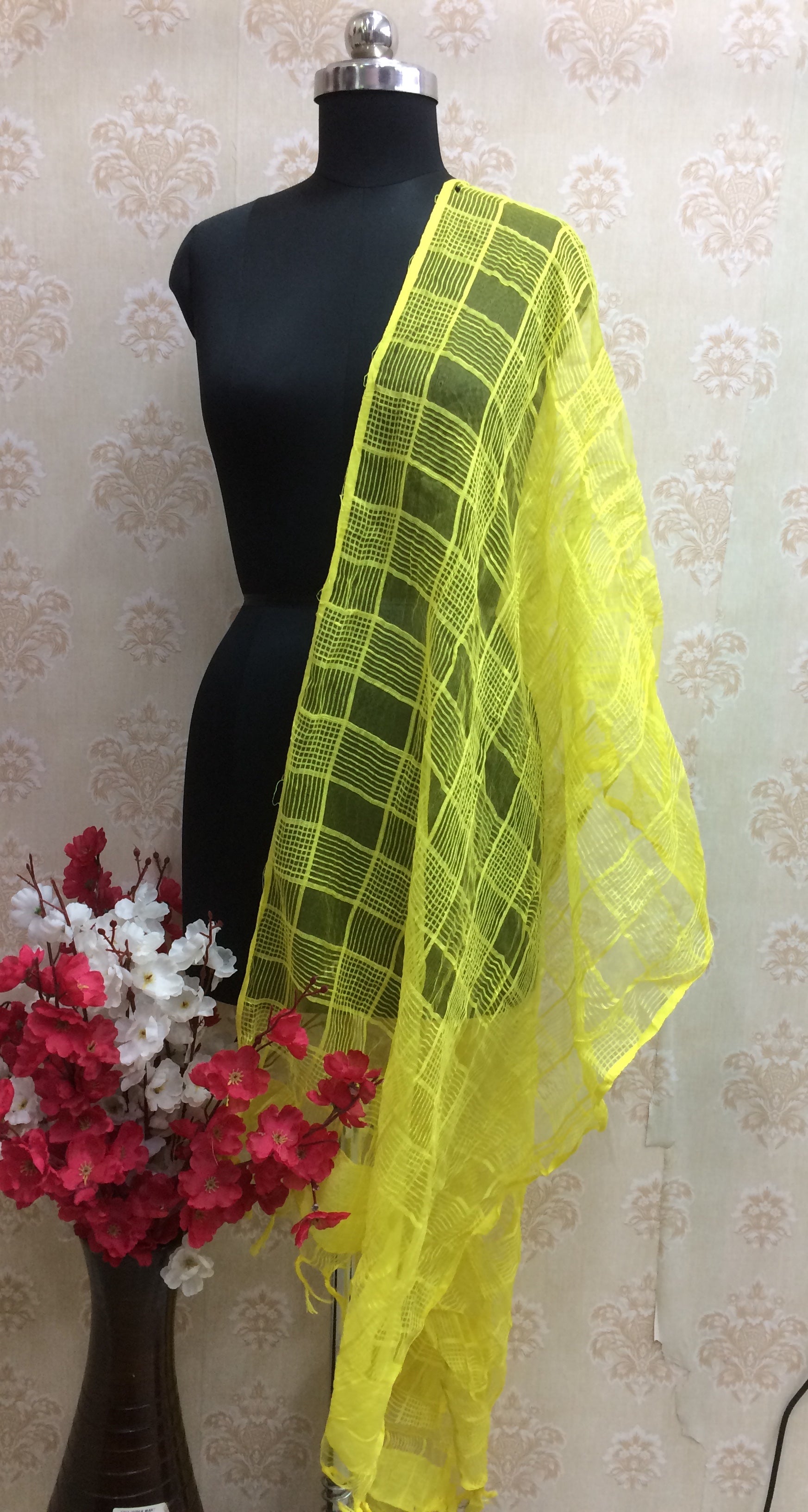 Add a playful and modern touch to your ethnic wardrobe with this bright yellow checkered dupatta. The vibrant, sunshine yellow color is perfect for brightening up any outfit, and the unique all-over checkered pattern provides a contemporary feel.