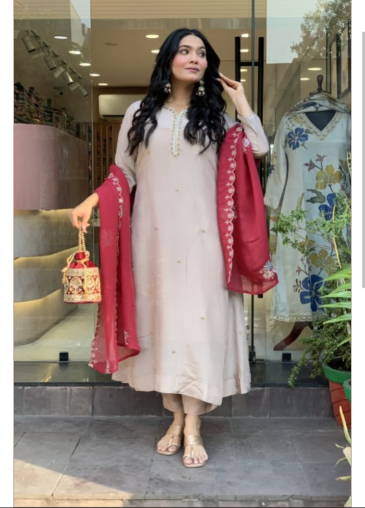 Step into timeless grace with this stunning Light Beige Kurta Set, a perfect blend of classic elegance and contemporary style. Crafted from luxurious fabric, this Indian ethnic wear ensemble features a beautifully tailored, long straight-cut kurta and comfortable matching trousers, complemented by a vibrant Deep Red Chiffon Dupatta with subtle detailing. Ideal for festive occasions, Eid, Diwali, or as sophisticated party wear and wedding guest attire.