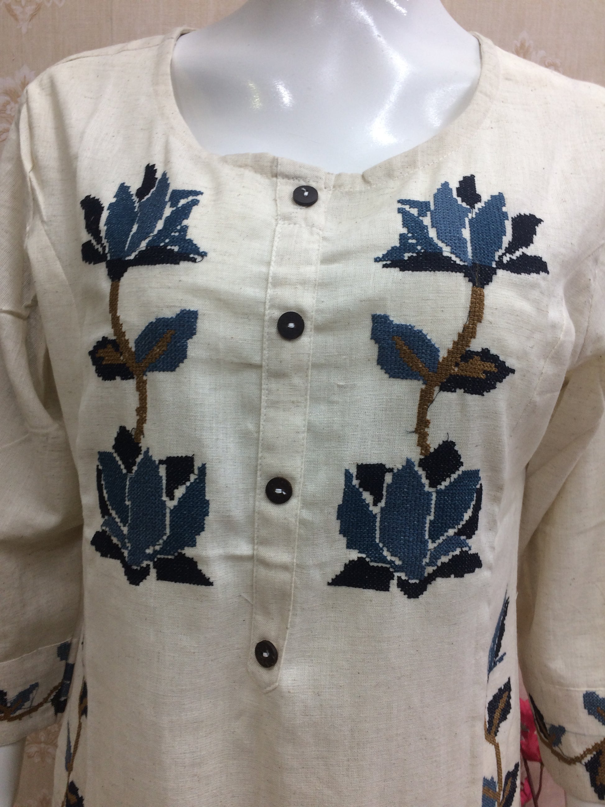 Elegant cream kurti with blue floral embroidery