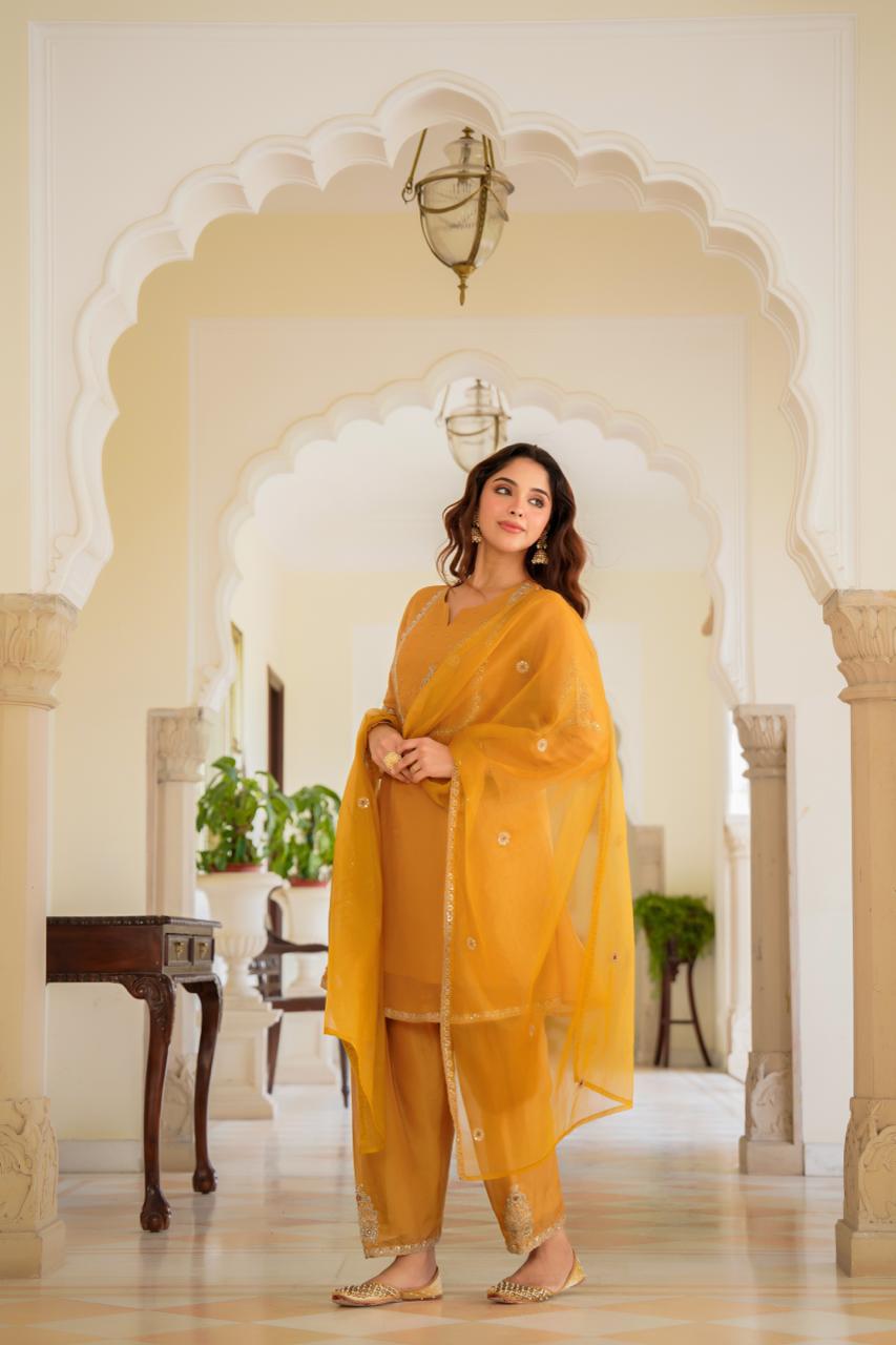 Step into the spotlight with this stunning Mustard Yellow Kurta and Salwar Set, a perfect fusion of traditional elegance and contemporary style. Crafted for festive occasions, haldi ceremonies, or any special event, this outfit is designed to make you feel radiant.