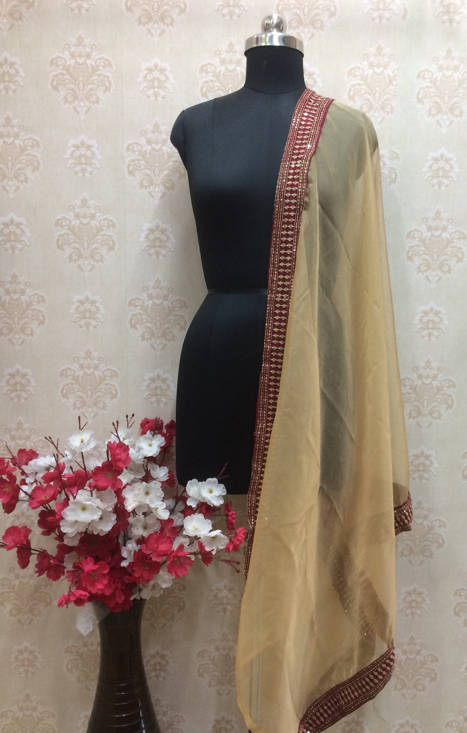 Golden Yellow Organza Dupatta with Maroon Sequin Border Work