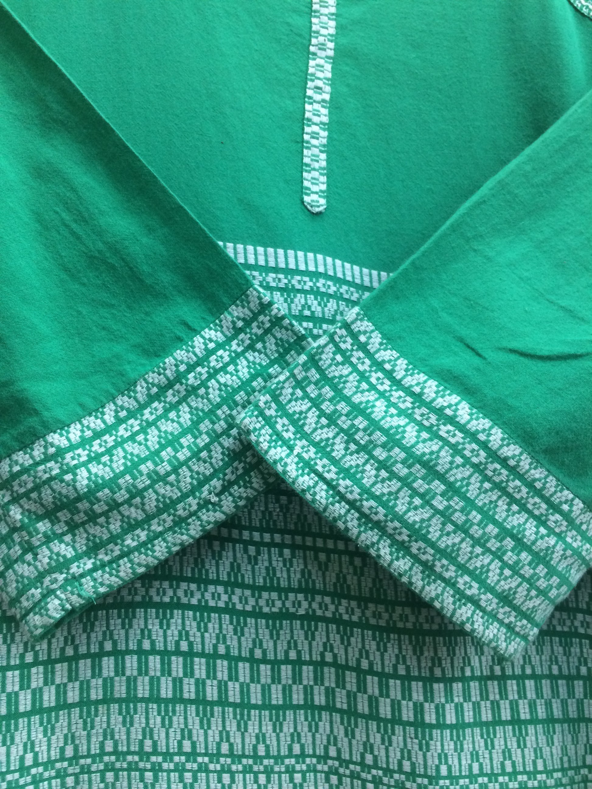 The kurti features a sophisticated design combining two tones of green. The upper yoke and sleeves are a solid sea green color, beautifully highlighted by intricate white embroidery along the square-cut neckline and the 3/4 sleeves. The lower body and border showcase a subtle geometric print that adds a modern yet traditional flair.