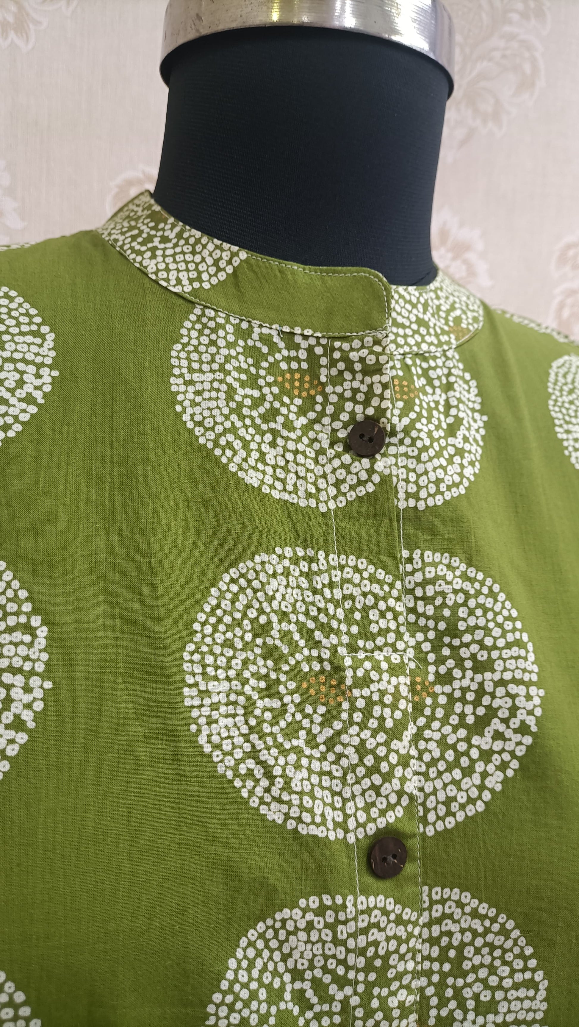 Serve that clean-girl aesthetic with this green printed cotton kurti, designed for max comfort and everyday style. The bold circular print adds a trendy, artsy vibe, while the mandarin collar and front button-down design keep the look crisp and structured.
