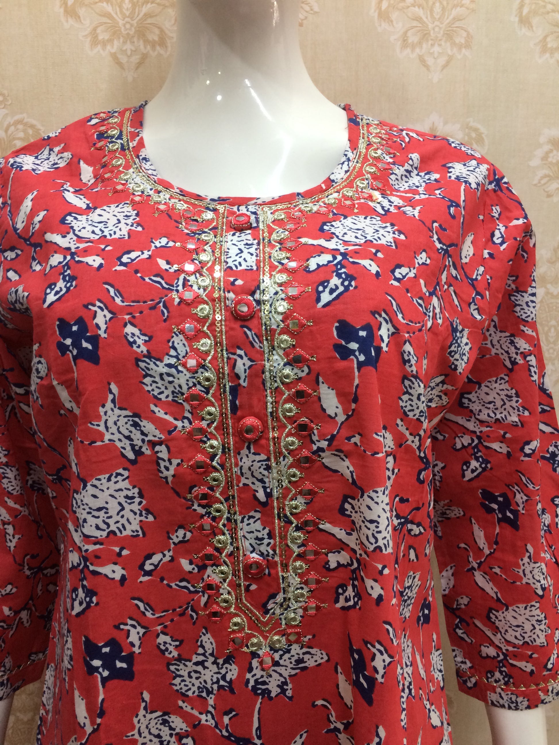 Brighten up your wardrobe with our vibrant red floral print cotton suit set. Crafted from soft and breathable cotton material, this 3-piece ensemble is perfect for comfortable all-day wear. The lively red kurta features a beautiful floral design with delicate gold accents around the neckline. It's paired with coordinating printed pants and a striking navy blue and red geometric print dupatta, adding a stylish contrast to the overall look. Ideal for casual outings, festive occasions, or adding a pop of color to your daily style.