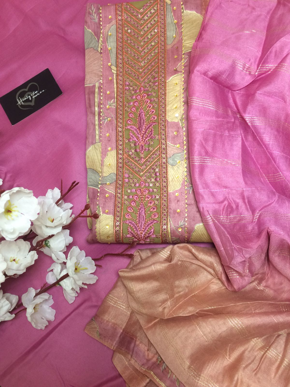 The beautiful set includes a top with delicate embroidery and sequins, a matching plain bottom, and a coordinating printed paper cotton dupatta. The intricate floral and geometric patterns provide a sophisticated look, perfect for a variety of occasions, from festive celebrations to daily wear. With this 3-piece set, you have the freedom to design a suit tailored to your exact measurements, ensuring a flawless and comfortable fit.