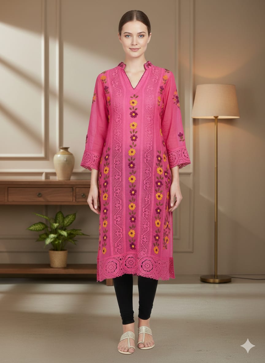 Step into bohemian elegance with our beautifully handcrafted crochet kurti. This stunning piece is a true work of art, featuring intricate crochet patterns and vibrant floral embroidery that add a unique, artistic touch to your wardrobe.