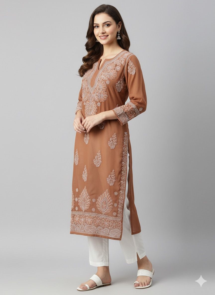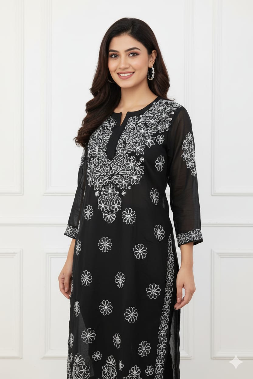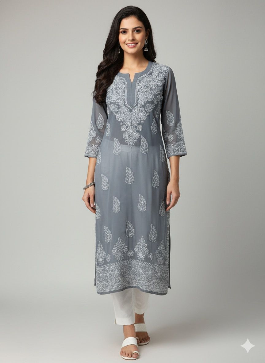 Hand-embroidered with authentic Lucknawi Chikankari, each intricate motif tells a story of meticulous artistry. The delicate, hand-stitched patterns on the lightweight, ethereal Georgette fabric create a stunning, semi-sheer drape that exudes grace and luxury. The breathable nature of the fabric ensures you stay comfortable while making an unforgettable style statement.
