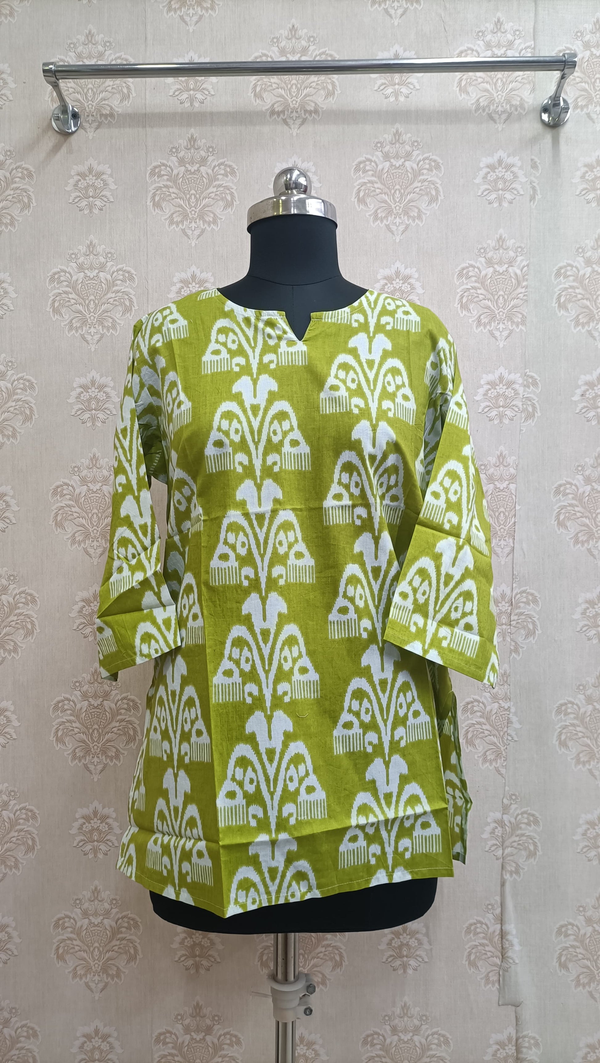 Brighten your wardrobe with this vibrant Lime Green Cotton Tunic, perfect for warm weather. This short kurti combines comfort and unique style, featuring a bold, repeated white pattern reminiscent of traditional Ikat or stylized Tree motifs.