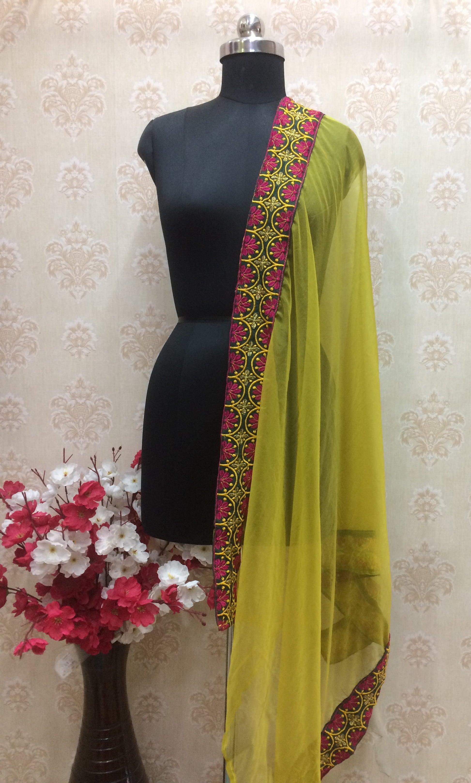 Lime Yellow Chiffon Dupatta with heavy embroidery border