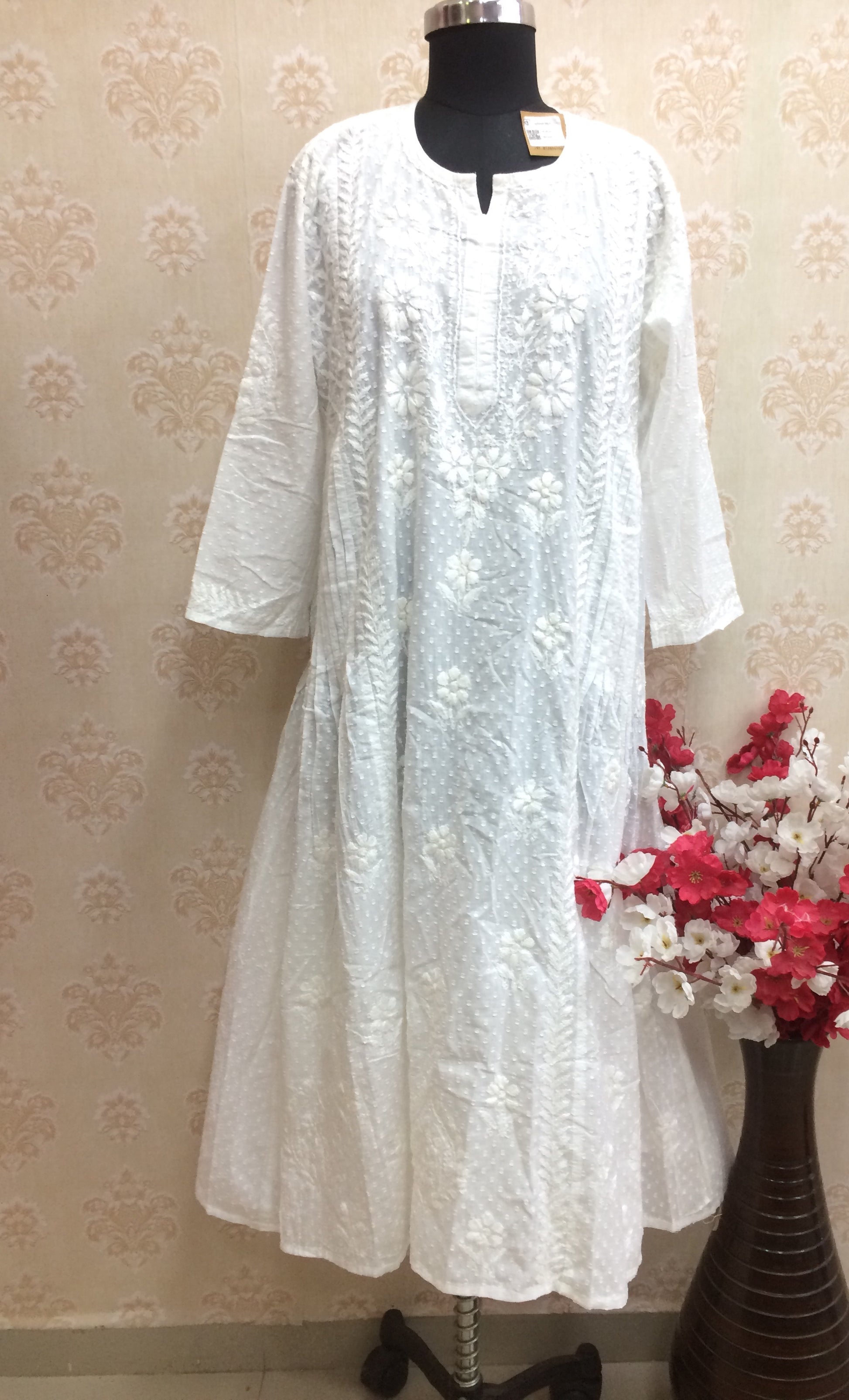 Step into a world of subtle elegance with our beautiful Lucknawi Style Cotton Gown. This sophisticated piece is a testament to traditional craftsmanship, blending the comfort of cotton with rich, tone-on-tone embroidery. Its flared silhouette and intricate details make it perfect for any special occasion