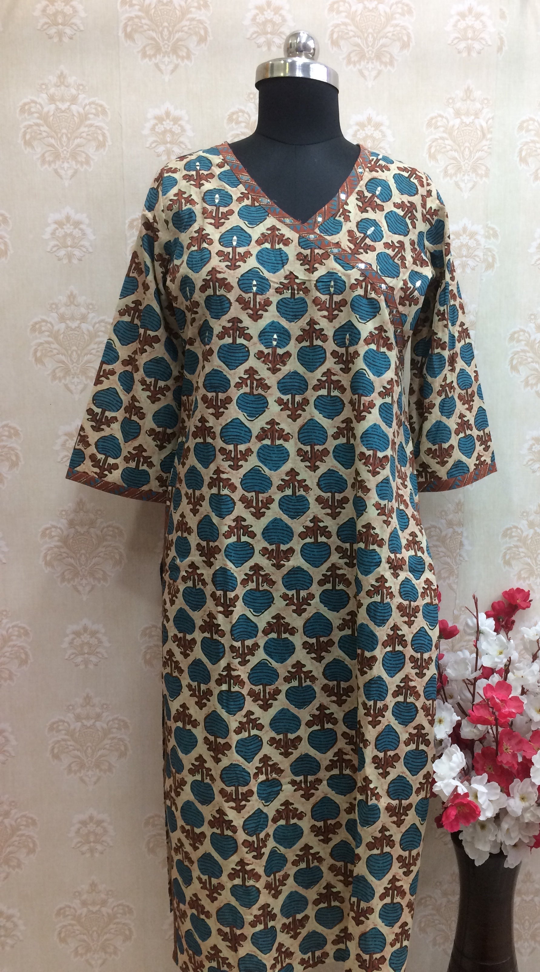Crafted from soft, breathable pure cotton, this straight-fit kurta is perfect for daily wear, casual outings, or the office. The beautiful traditional Mughal or Jaipuri-style block print features a repeating motif in earthy beige, brown, and teal blue, giving the garment a rich, artisanal feel.