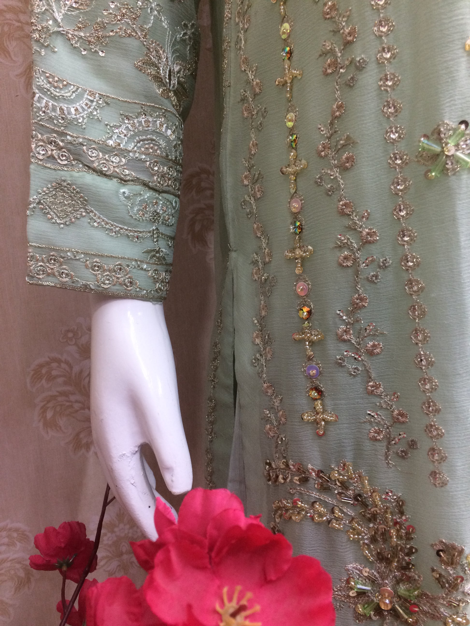 Mint Green Embroidered Chiffon Pakistani heavy dress