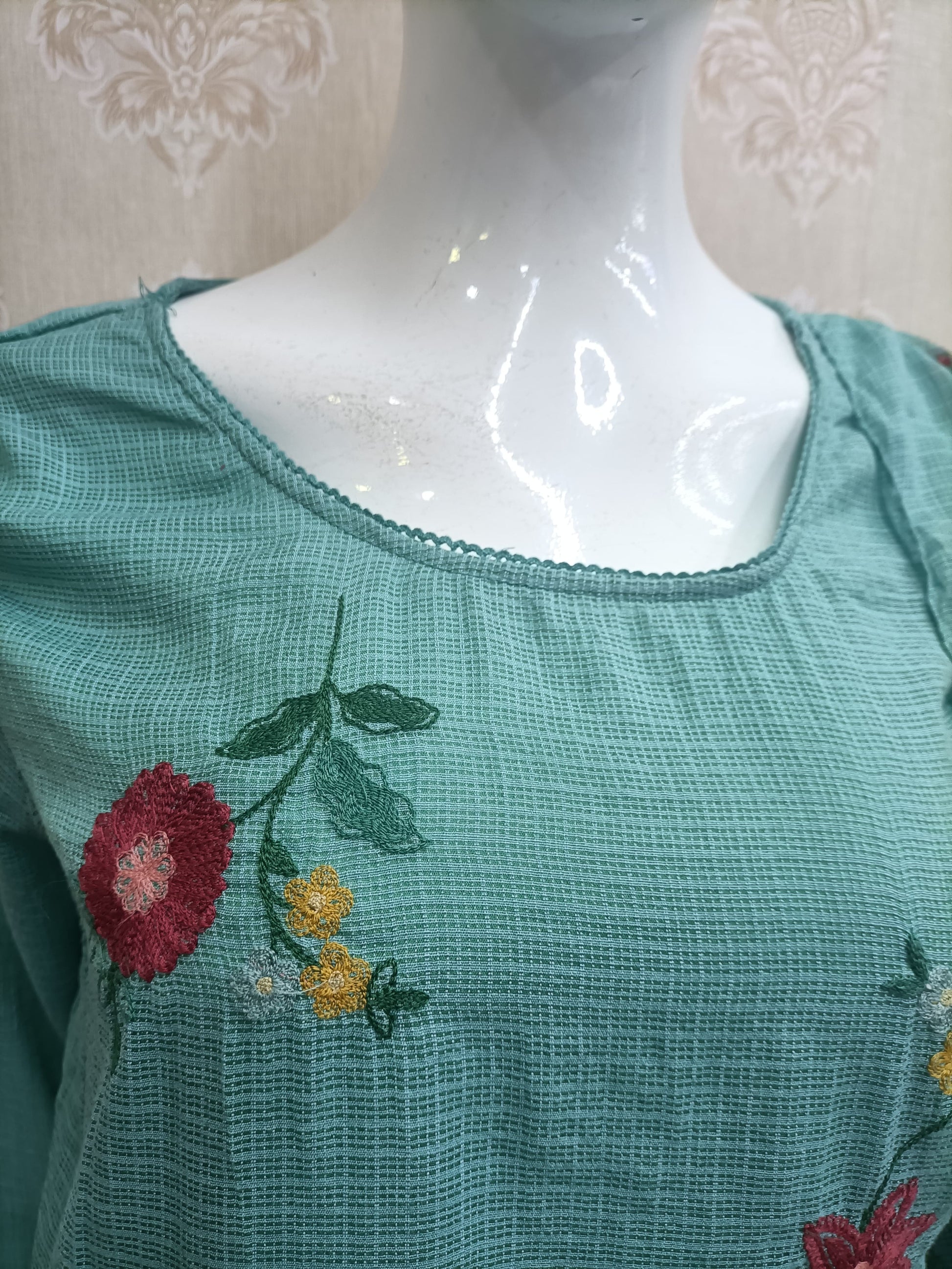 Color & Fabric: Features a soft, tranquil Mint Green (or Aqua Blue) textured fabric (likely cotton or a blend) that offers a soothing aesthetic. The straight-cut Kurti is subtly embroidered or printed with delicate floral motifs in rich reds, mustards, and greens.