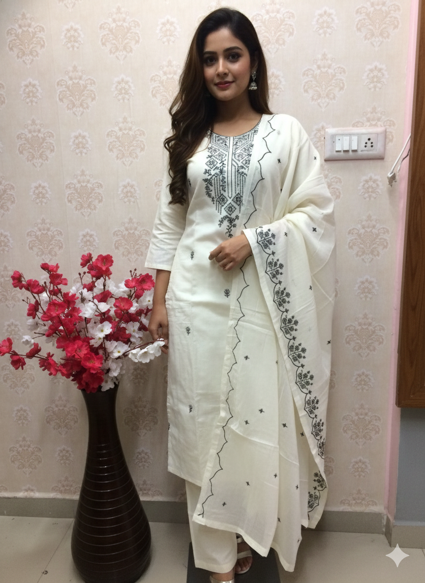 Embrace timeless style with our elegant off-white and black cotton suit set. Crafted from soft and breathable cotton fabric, this 3-piece ensemble offers both comfort and sophistication. The kurta features a delicate black embroidered pattern around the neckline, creating a striking contrast against the subtle off-white base. The set is complete with coordinating black pants and a matching off-white dupatta adorned with black detailing. Perfect for everyday wear, casual outings, or a smart semi-formal look.