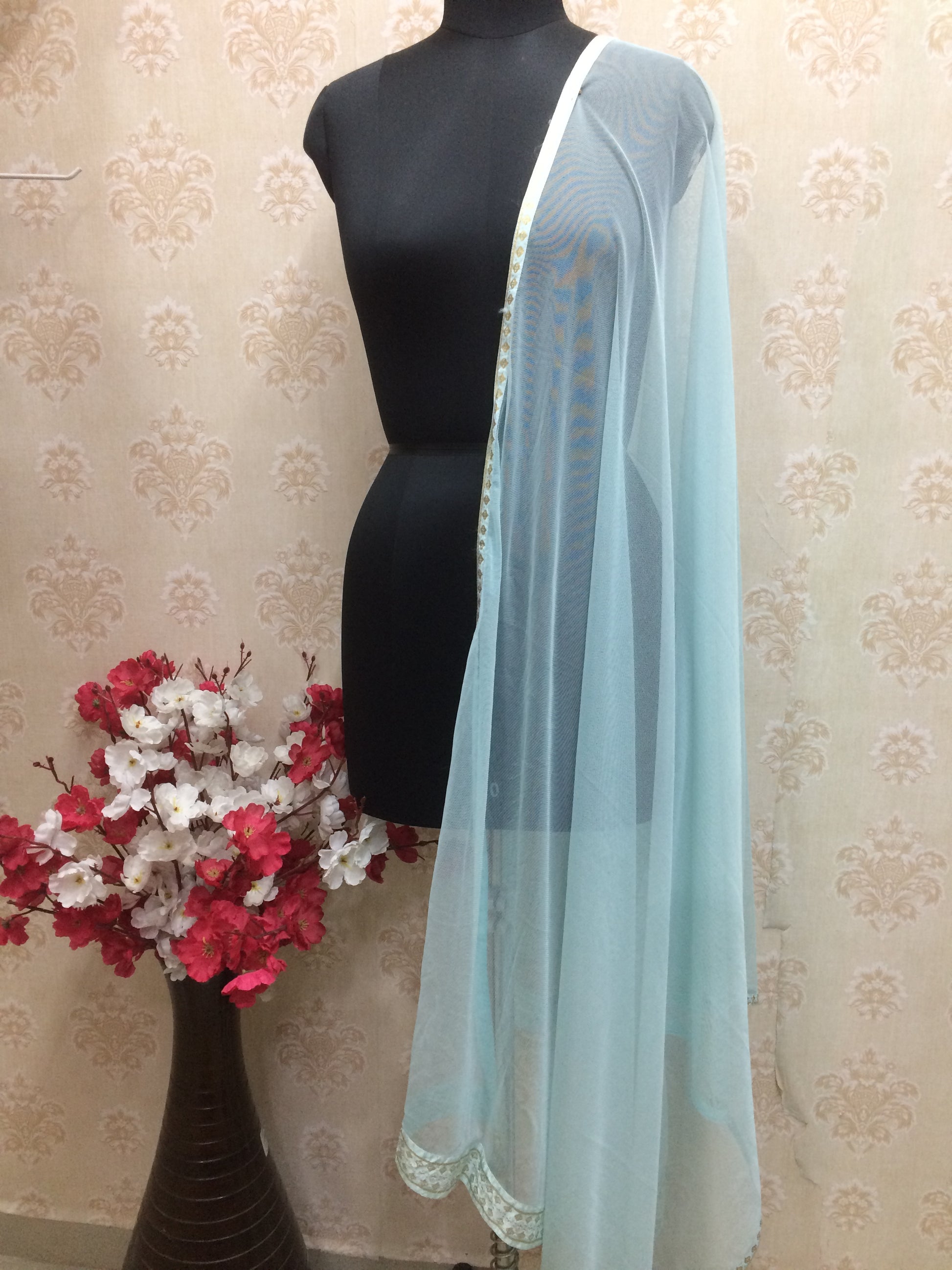 Net Dupatta in Pastel Aqua Blue with Delicate Lace Trim
