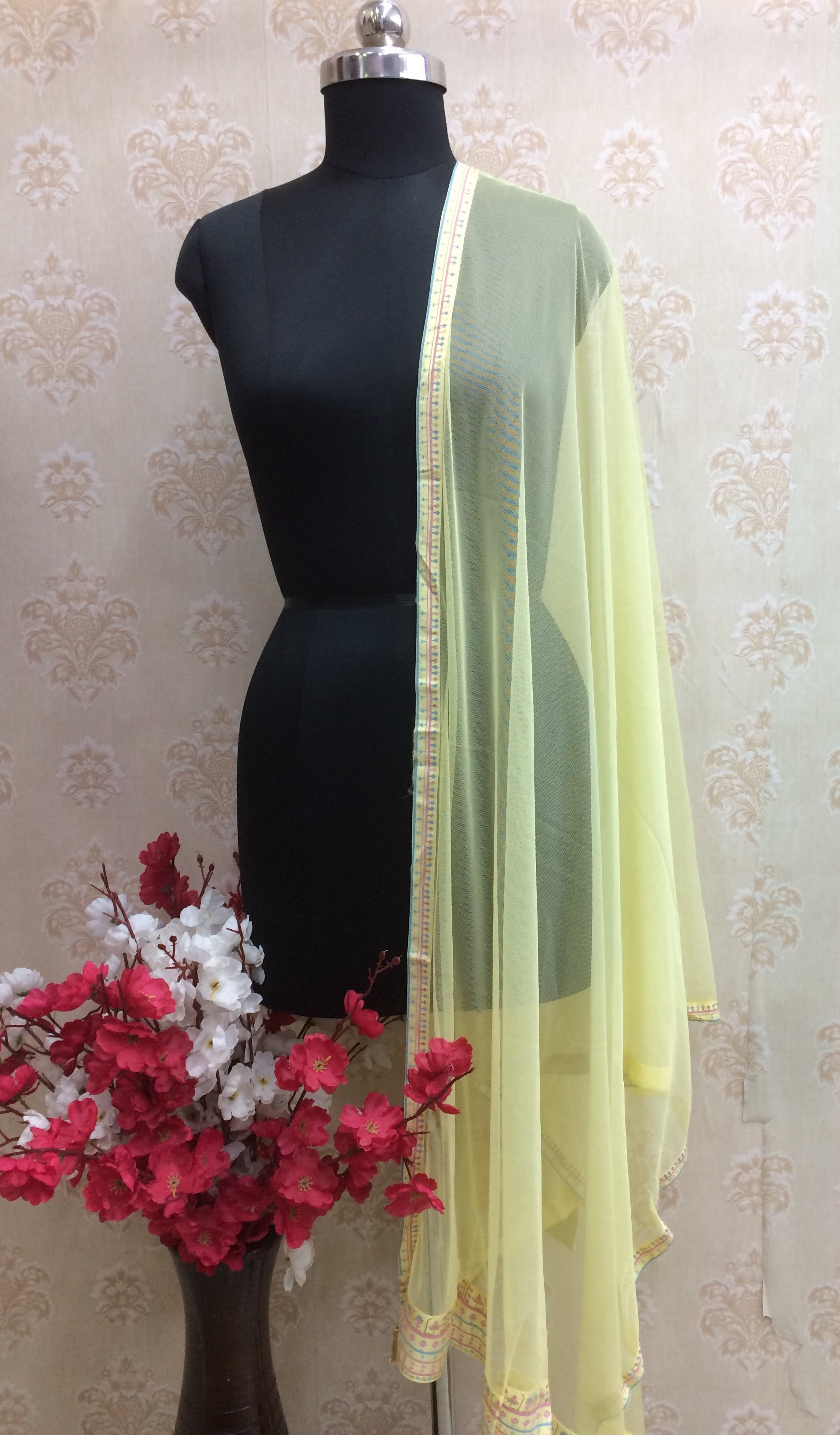 Add a touch of delicate charm to your wardrobe with this beautiful pastel yellow net dupatta. The sheer and lightweight fabric creates a soft and graceful drape, perfect for a subtle and elegant look. The subdued, lovely yellow color is ideal for day events, festive celebrations, and wedding functions.