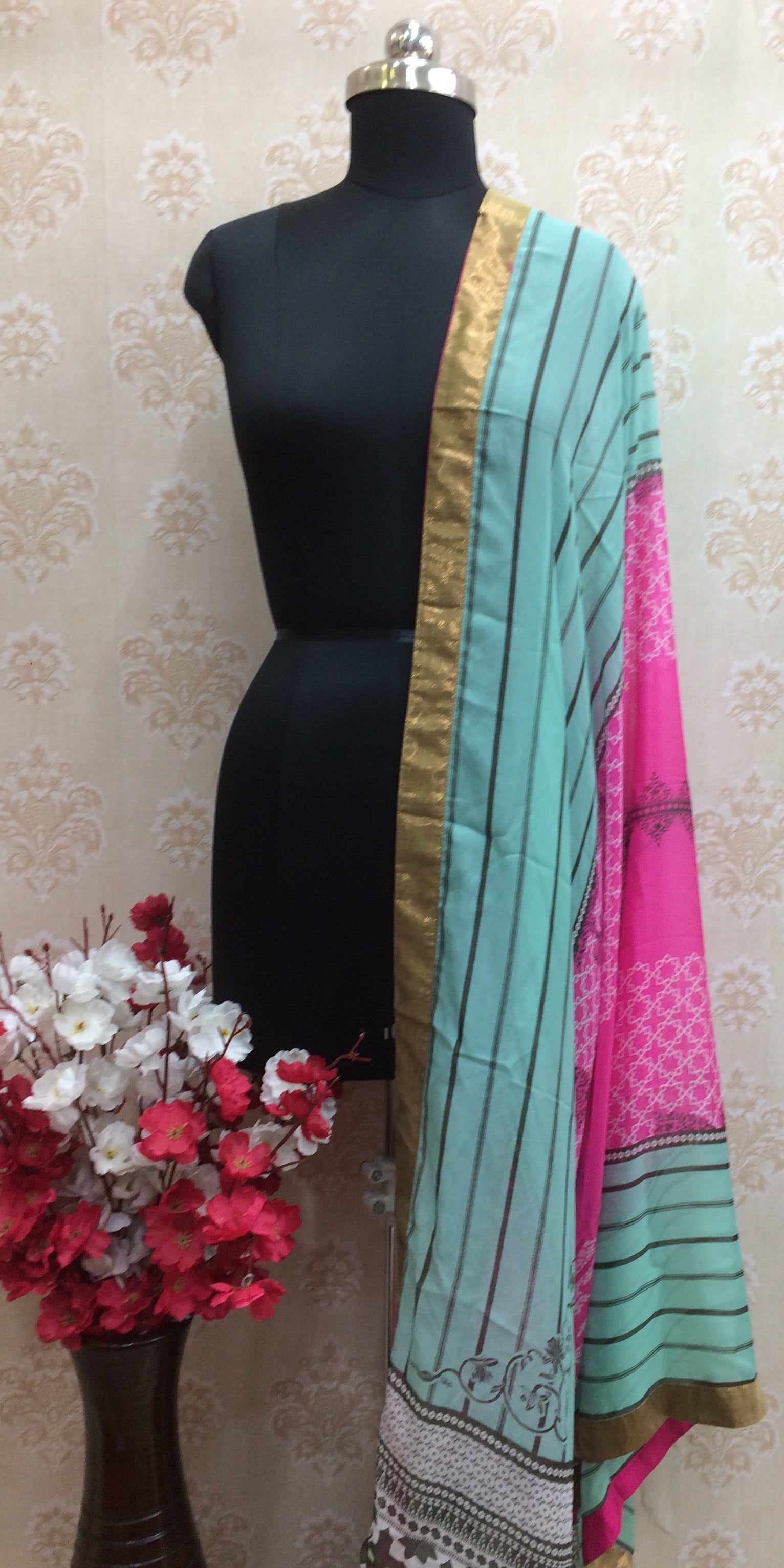 Pink and aqua Chiffon Dupatta with black printed and golden border