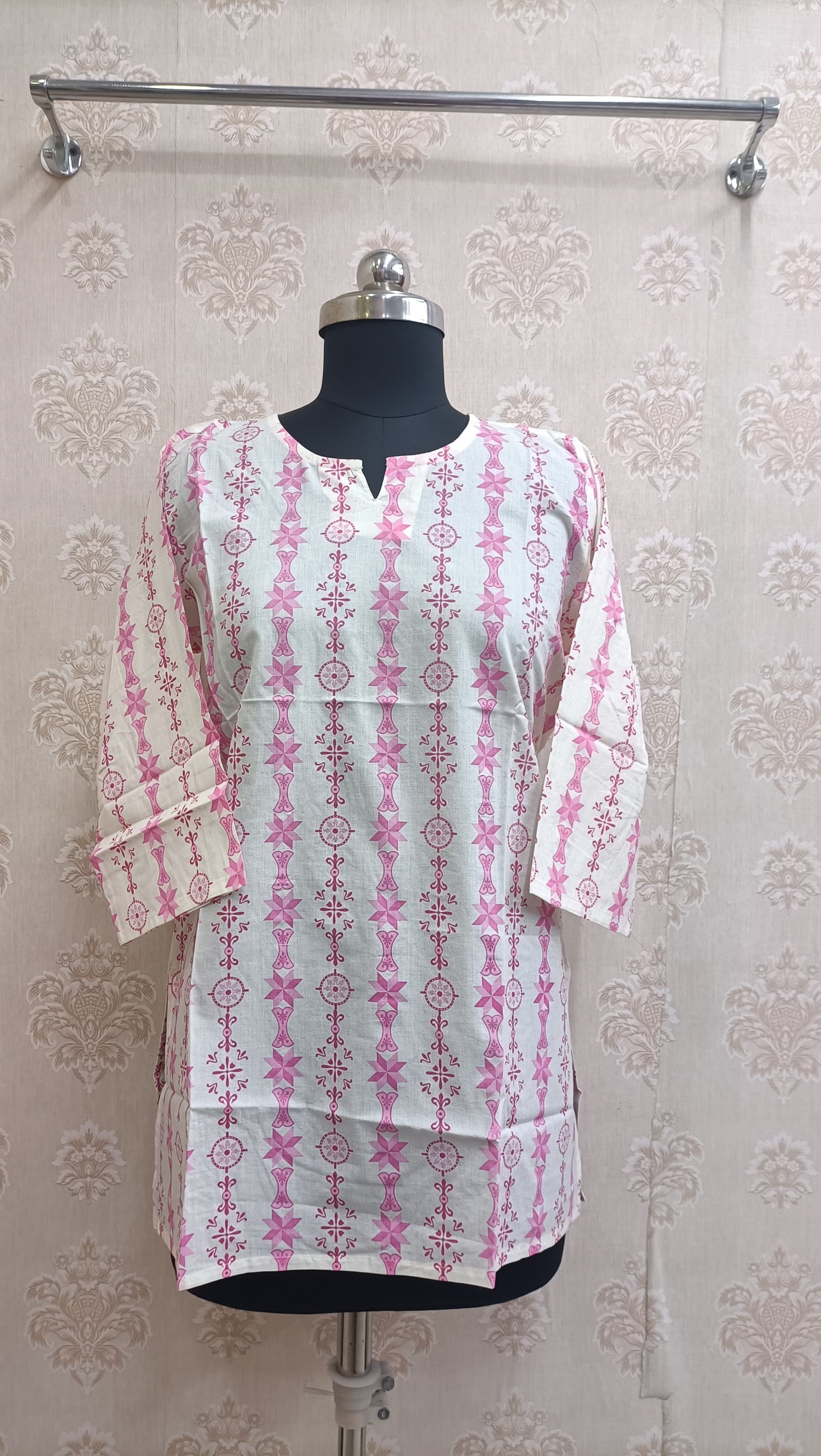 Bring some soft-girl energy to your wardrobe with this pink and white printed cotton kurti. Featuring a soothing colour palette and a unique vertical motif print, this piece is all about effortless style. The notch neckline and 3/4th sleeves keep it simple yet chic, making it perfect for daily wear.