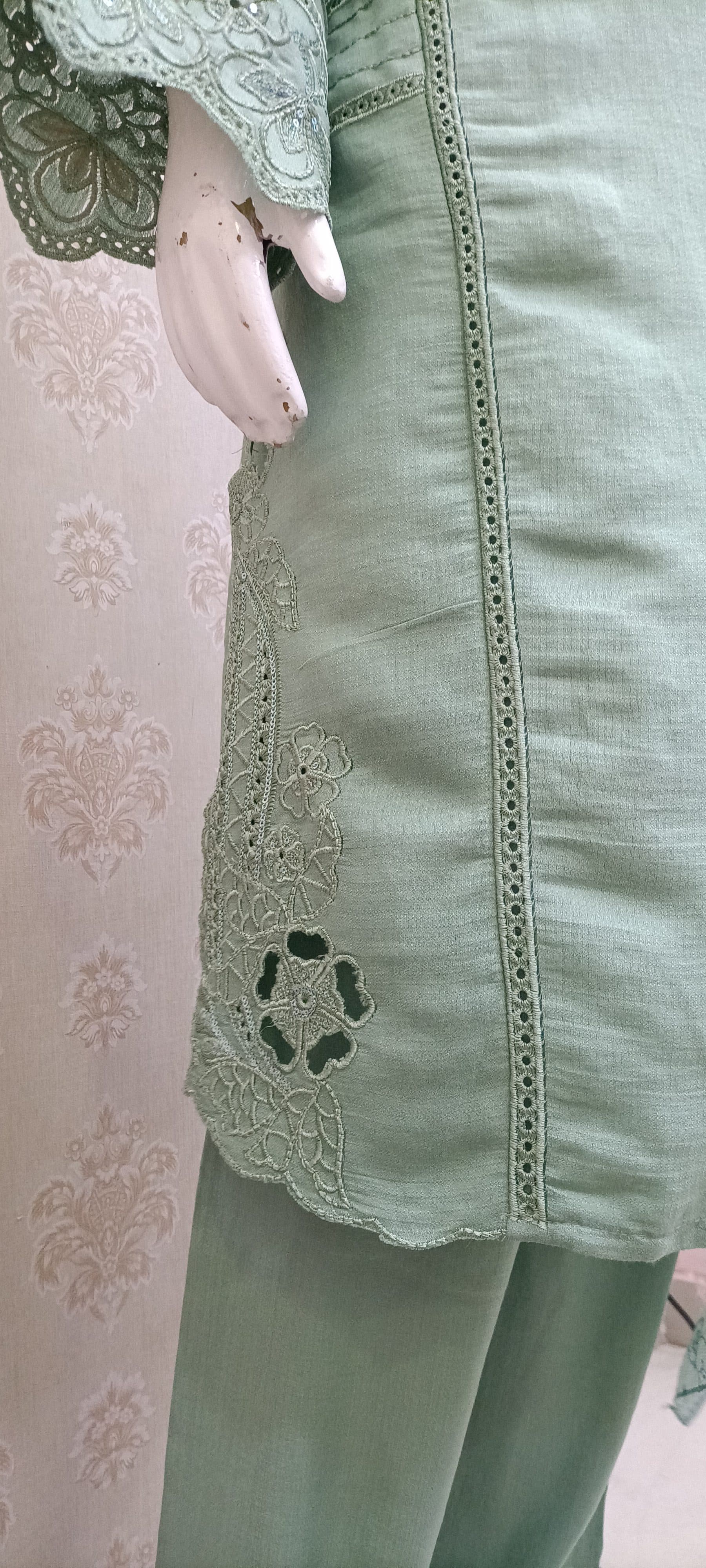 The beautiful self-embroidered and laser-cut detail on the yoke and neckline immediately draws the eye, offering a unique, premium look. The comfortable straight-cut shirt is paired with elegant, matching trousers featuring a delicate scalloped, lace-trimmed hem.