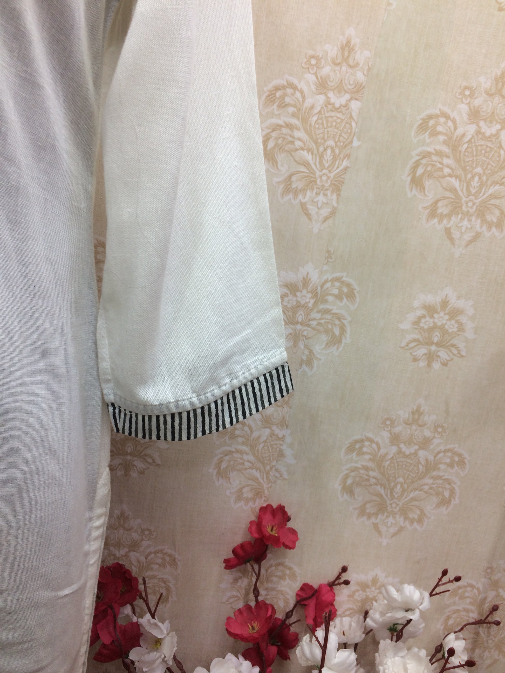 Crafted from a soft, breathable cotton slub fabric, this straight-cut kurta is your ideal companion for summer days, casual outings, or comfortable office wear. The crisp white hue provides a beautiful backdrop for the striking heavy black thread embroidery that graces the entire neckline and placket area. This detailed floral embroidery (sometimes referred to as Chikankari style) adds a sophisticated, dressy touch.