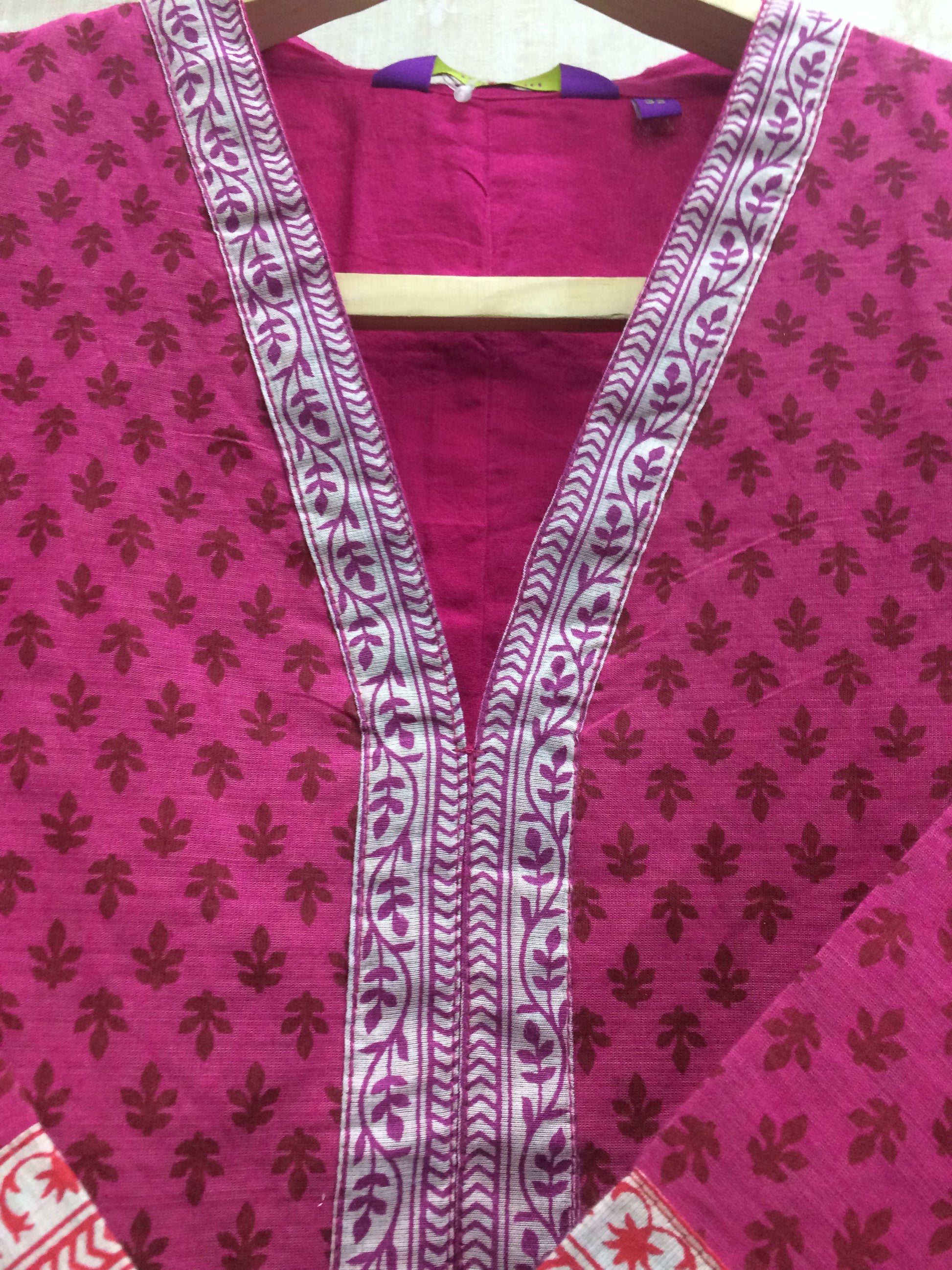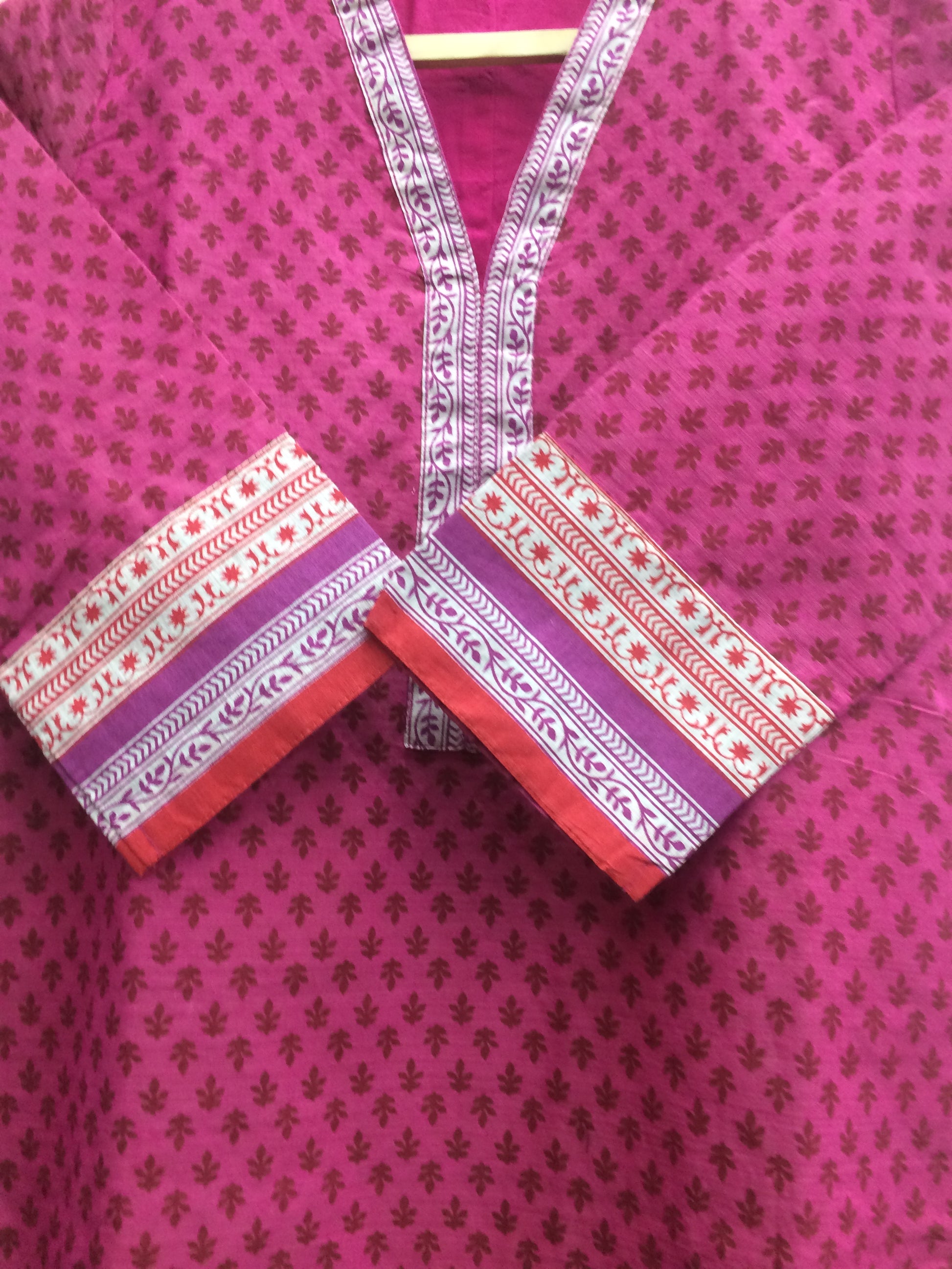 This beautiful pink kurta features a subtle, all-over traditional block print pattern, giving it a classic and authentic look. The vibrant magenta fabric is perfectly complemented by the exquisite contrast detailing at the V-neckline and the striking printed borders on the cuffs and hem. The neckline is further embellished with a delicate line of thread work or embroidery, adding a touch of sophistication.