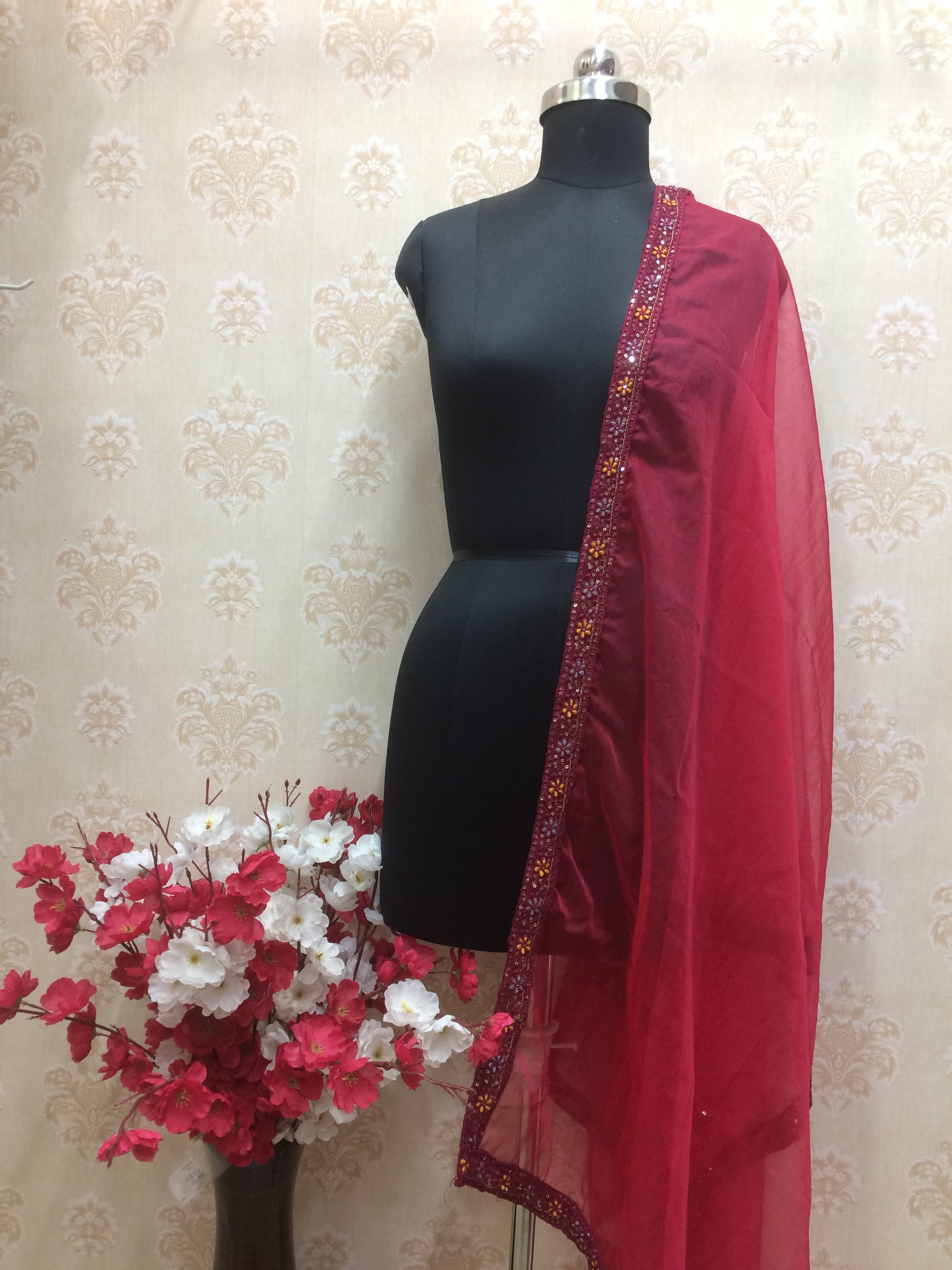 Make a statement with this stunning Rich Maroon Net Dupatta. Its deep, regal color and sparkling border make it the perfect accessory to add depth and glamour to your festive or wedding attire.