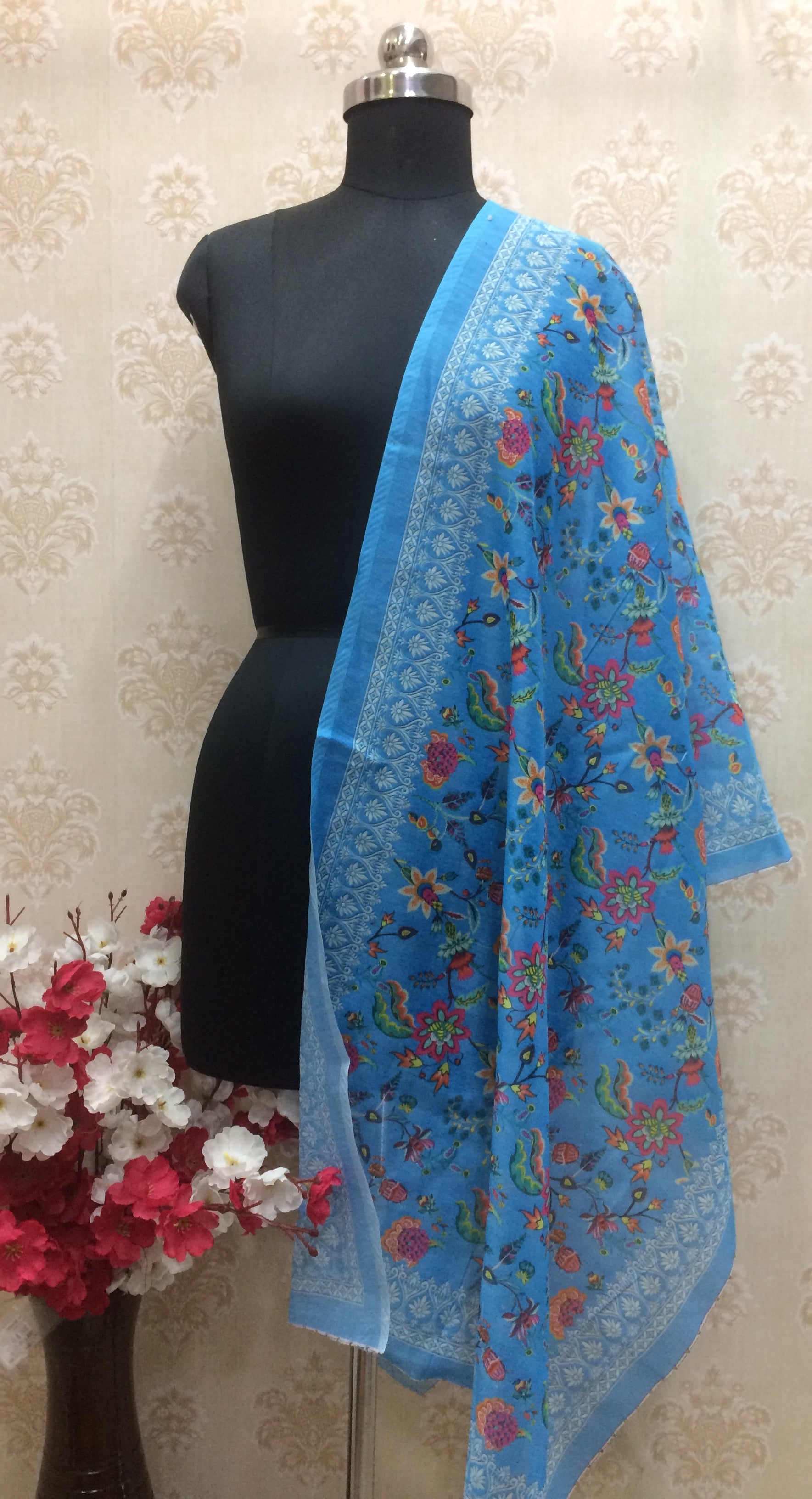 Vibrant Blue Floral Printed cotton Dupatta with White Border
